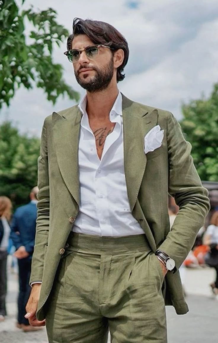 El look boho chic masculino se caracteriza por trajes de lino o algodón en tonos neutros como beige, arena, verde oliva o azul claro. Las camisas suelen ser de telas ligeras, a veces con cuello mao o sin corbata, y pueden llevar estampados sutiles o bordados artesanales.